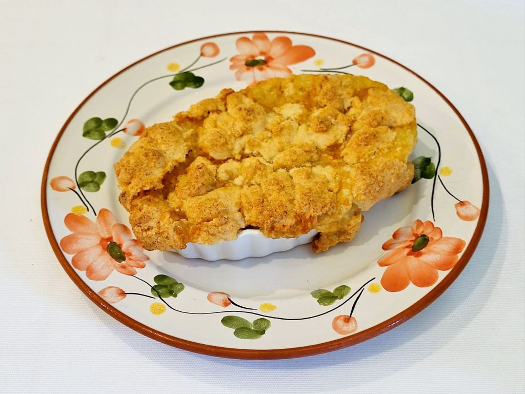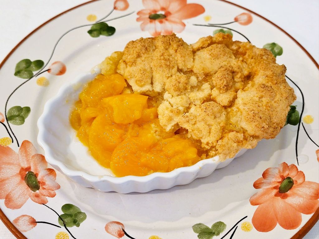 - Spread over peaches (or apples) in baking dish. Bake at 350 degrees until done (approximately 20 to 30 minutes.)