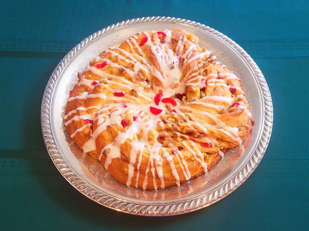 - Place on greased cookie sheet. With scissors, cut roll in half lengthwise. Place one strip across the other to make an "X", keeping cut sides up. Now, starting at center and working to either end, loosely criss-cross strips. Form into ring and seal ends together. Let rise in warm place until double in bulk.