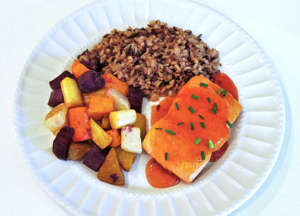 “I was invited out to a work dinner by my boss to the ‘fancy’ restaurant in town, The Mustard Seed. I had been in Davis for almost 25 years, but had never been before. It was so hard to choose among the many amazing options, including Duck Breast with Huckleberry Sauce and Scallops with Red Coconut Curry Sauce. I opted for the Salmon with Sweet Chili Sauce served with wild rice and roasted vegetables. Interestingly, just the weekend before I had added my own recipe for Sweet Chili Sauce to the cookbook. To say the meal was fantastic was an understatement, but I was very proud to say that my Sweet Chili Sauce tasted just like theirs! This my recreation of that meal, and the what’s even better is that it is super simple to make. ” – April Ferre